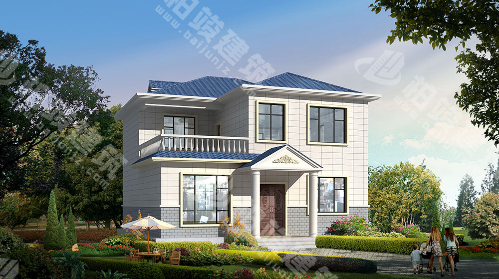 外墙涂装:米色真石漆拉出方块线条,搭配米灰色小块面砖,砌筑田园风情